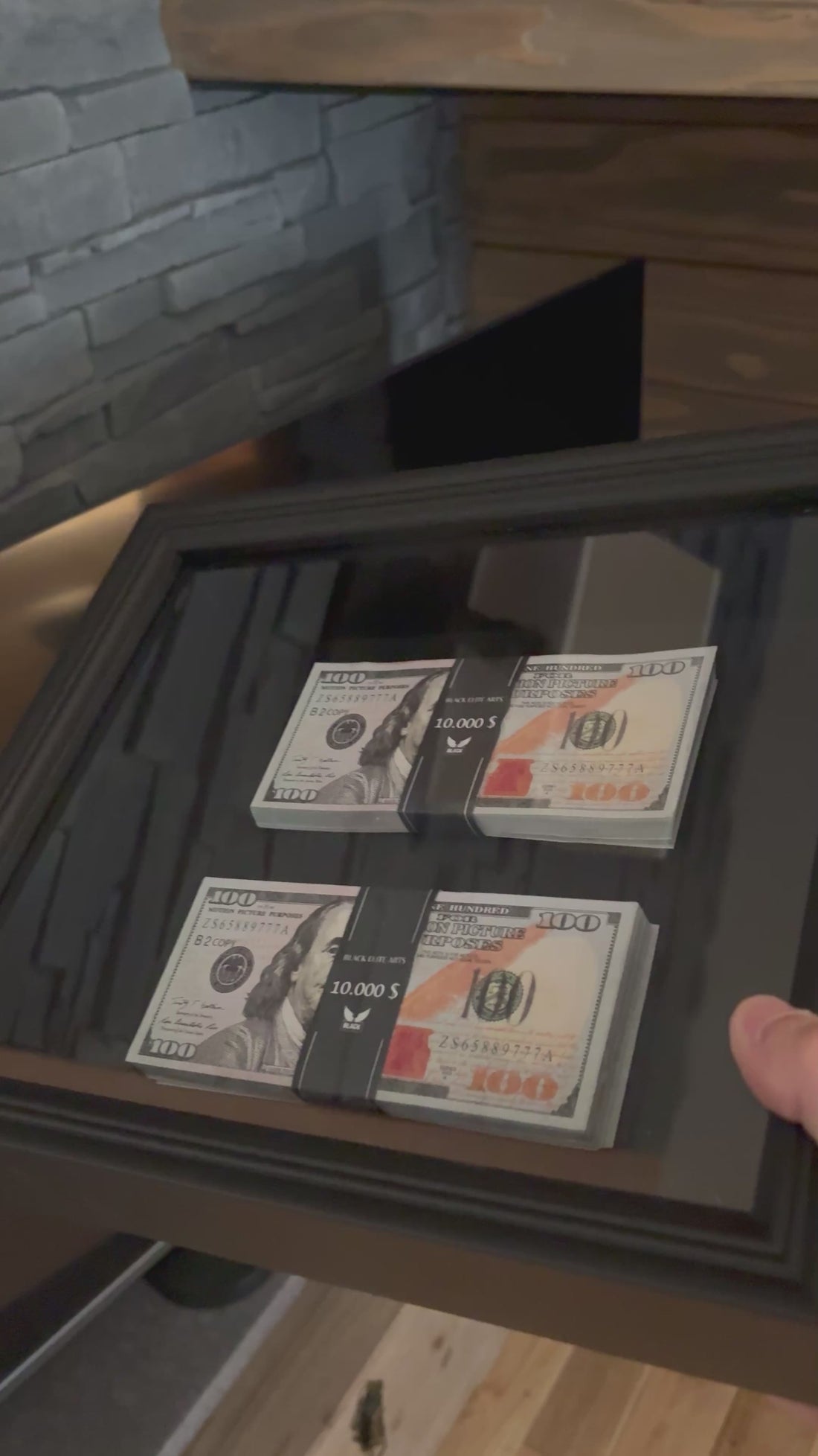 Chaque billet factice de 100 $ est soigneusement aligné et mis en valeur sous une vitre transparente, créant un effet visuel puissant et inspirant. Le contraste du fond noir et du cadre mat renforce cette impression de prestige et de raffinement, typique de l’univers Black Elite Arts.